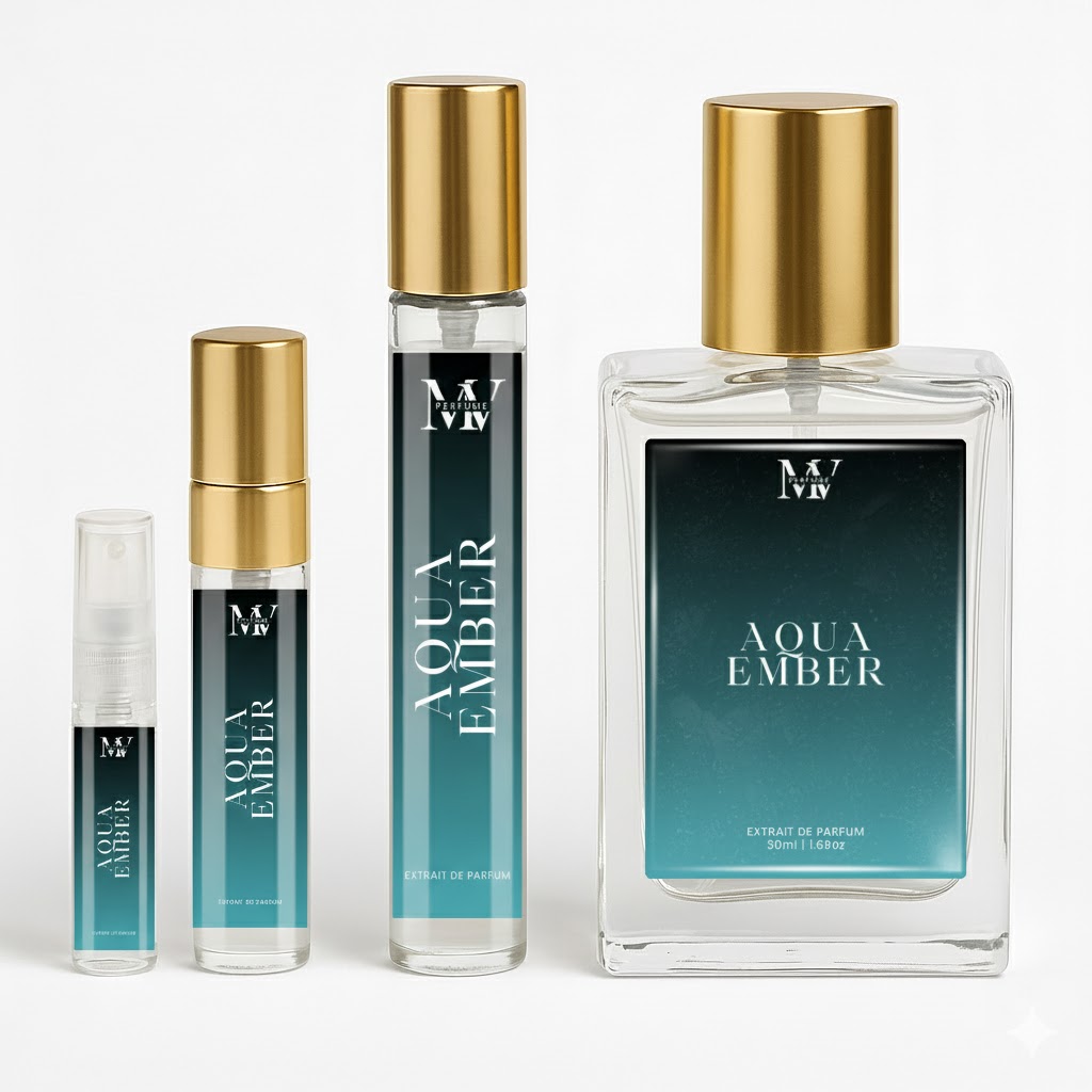 Aqua Ember opens with a splash of fresh marine breeze, cooling citrus, and clean mineral notes. As it dries, warm woods and soft musk come forward, creating a fresh-but-warm aquatic blend that feels like the ocean meeting sunset.